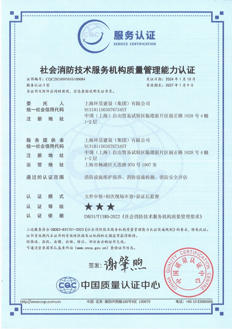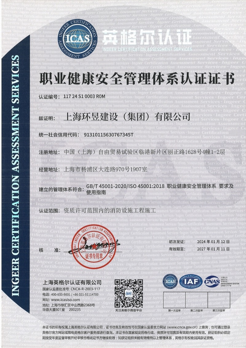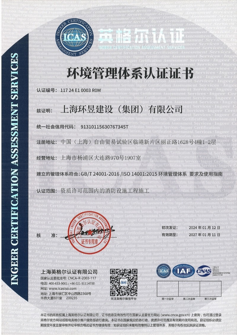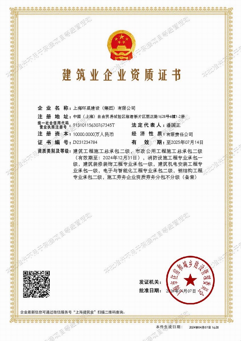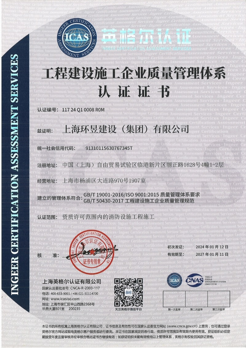 上海环昱建设(集团)有限公司成立于一九九九年二月,拥有国家住建部颁发的消防设施工程和建筑装修装饰工程承包壹级资质,房屋建筑工程施工总承包贰级和市政公用工程施工总承包叁级资质,机电设备安装工程承包和钢结构工程承包贰级资质(资质证书号为D231234784),注册资金为一亿元。